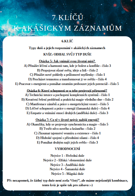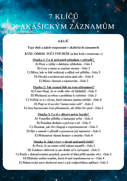 Součástí webináře je také zábavný kvíz a pracovní list, který ti pomůže identifikovat tvůj primární typ duše. Možná objevíš, že v sobě máš kombinaci několika typů - to je naprosto běžné a vysvětluje tvou jedinečnost.